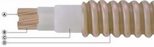 A.導(dǎo)體:絞合銅導(dǎo)體;B.絕緣:組成云母帶;C.填充:無機(jī)資料;D.銅套:縱包焊接并軋紋